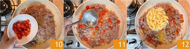 Fügt auch die Kirschtomaten hinzu 10 und eine Schöpfkelle Kochwasser der Pasta 11. Kocht noch für ein paar Minuten weiter, dann schaltet das Feuer aus. Gießt die Pasta ab und gebt sie direkt in die Pfanne 12.