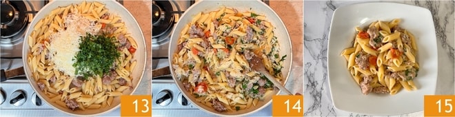 Vervollständigt mit geriebenem Pecorino und gehackter Petersilie 13, dann mischt schnell und gut, um alles zu verbinden 14. Serviert die Pasta mit Wurst heiß 15!