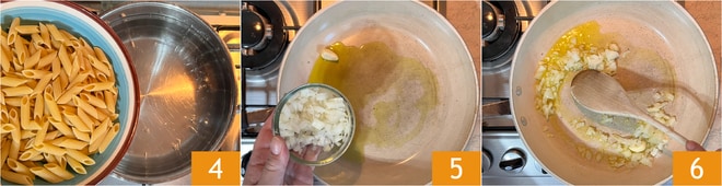 Wenn das Wasser kocht, gebt die Pasta hinein und kocht sie al dente 4. In der Zwischenzeit erhitzt das Öl in einer Pfanne, fügt dann den Knoblauch und die Zwiebel hinzu 5 und bratet alles für ein paar Minuten an 6.