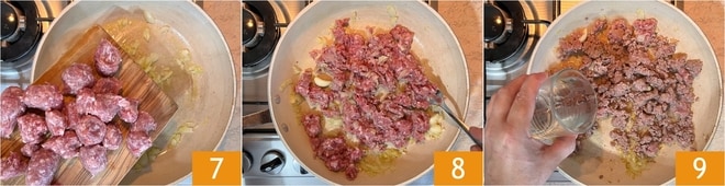 Fügt die Wurst hinzu 7 und zerdrückt sie mit einer Gabel 8. Wenn sie gut angebraten ist, salzt und pfeffert sie und löscht mit dem Weißwein ab 9, wobei ihr darauf achten sollt, dass der Wein vollständig verdampft.