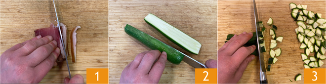 Um die Pasta mit Zucchini, Speck und Gorgonzola zuzubereiten, stellen Sie zuerst einen Topf mit Wasser auf den Herd, um die Pasta zu kochen. Schneiden Sie den Speck in dünne Streifen 1. Putzen Sie die Zucchini, halbieren Sie sie längs 2 und schneiden Sie sie dann in Würfel 3.