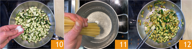 Salzen Sie 10 und garen Sie bei mittlerer Hitze etwa zehn Minuten. Tauchen Sie inzwischen die Linguine in das kochende, gesalzene Wasser 11. Sobald die Zucchini gar sind, entfernen Sie den Knoblauch 12 und reduzieren die Hitze.