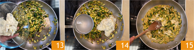 Geben Sie den Gorgonzola hinzu 13 und eine Kelle des Nudelkochwassers 14. Rühren Sie, damit sich der Gorgonzola sanft auflöst 15.