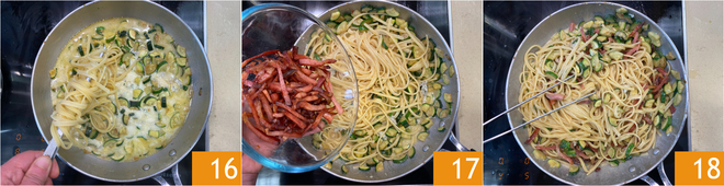 Gießen Sie die Pasta al dente ab und geben Sie sie in die Pfanne 16, dann fügen Sie den knusprigen Speck hinzu 17 und vermengen alles gut 18.