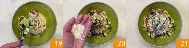 Richten Sie an 19 und vervollständigen Sie nach Belieben mit geriebenem Käse 20. Ihre Pasta mit Zucchini, Speck und Gorgonzola ist servierfertig 21!