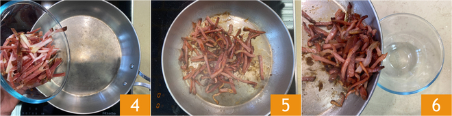 Geben Sie den Speck in eine gut erhitzte Pfanne 4 und braten Sie ihn ohne zusätzliches Fett bei mittlerer Hitze etwa 5 Minuten, bis er schön knusprig ist 5. Nehmen Sie den Speck aus der Pfanne und stellen Sie ihn beiseite 6.