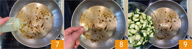 Geben Sie in dieselbe Pfanne einen Schuss Olivenöl 7 und eine Knoblauchzehe 8, dann fügen Sie die Zucchini hinzu 9.