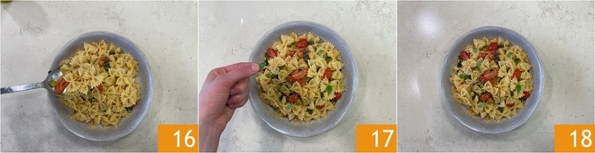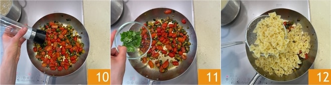 Wenn die Kirschtomaten weich sind, salzen 10, pfeffern und mit von Hand zerpflücktem Basilikum würzen 11. Fügen Sie dann auch die Farfalle hinzu, die al dente abgetropft sind 12.