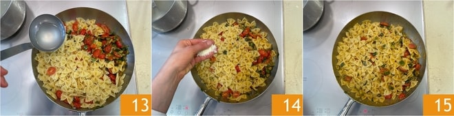 Fügen Sie eine Kelle Kochwasser hinzu 13, den geriebenen Pecorino 14 und werfen Sie alles zusammen 15.