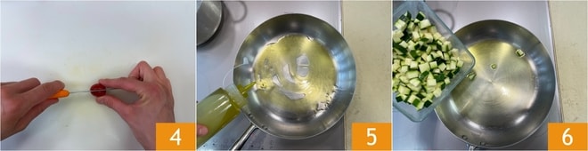 Waschen Sie auch die Kirschtomaten und halbieren Sie sie 4. Geben Sie in eine große Pfanne einen großzügigen Schuss Öl 5. Wenn Sie möchten, können Sie auch eine Knoblauchzehe oder in Scheiben geschnittene Zwiebel hinzufügen. Geben Sie dann die Zucchini hinzu 6 und braten Sie sie 5-7 Minuten an.