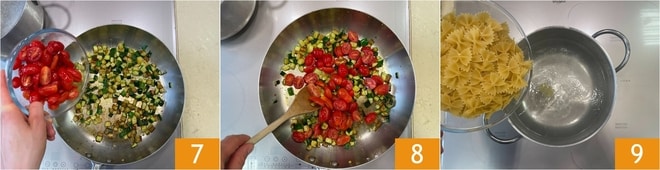 Fügen Sie die Kirschtomaten hinzu 7, mischen Sie 8 und kochen Sie weitere 5-6 Minuten. In der Zwischenzeit kochen Sie die Pasta in reichlich kochendem Wasser, gesalzen nach Geschmack 9.