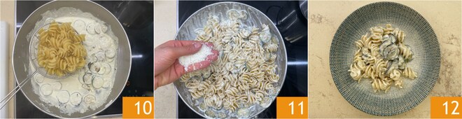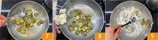Gegen Ende der Kochzeit der Pasta gießen Sie eine Schöpfkelle von deren Wasser in die Pfanne mit den Zucchini 7, dann fügen Sie den Stracchino hinzu 8. Schalten Sie die Hitze auf niedrig und rühren Sie gut um, bis Sie eine cremige Konsistenz erreichen 9, dann schmecken Sie mit Salz ab.