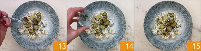 Vervollständigen Sie die Teller mit den beiseite gelegten Zucchini 13, Thymian und schwarzem Pfeffer nach Belieben 14. Ihre Pasta mit Zucchini und Stracchino ist servierfertig 15!