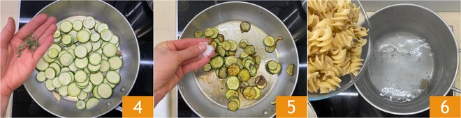 Verfeinern Sie mit den Thymianblättchen 4 und braten Sie sie bei mittlerer bis hoher Hitze etwa 5-7 Minuten an, dann salzen Sie 5. Legen Sie einige Zucchinischeiben für das Anrichten beiseite und bewahren Sie die anderen in der Pfanne auf. In der Zwischenzeit bringen Sie einen Topf mit gesalzenem Wasser zum Kochen und kochen Sie die Fusilloni al dente 6.