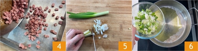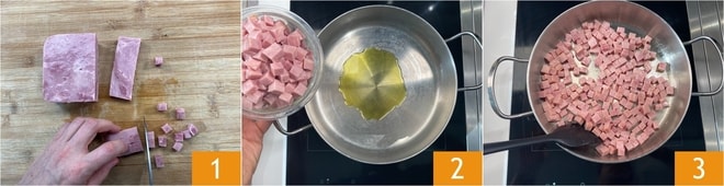 Um die cremige Pasta mit Schinken und Erbsen zuzubereiten, bereiten Sie zuerst die Gemüsebrühe nach unserem Rezept vor. Schneiden Sie den gekochten Schinken in Würfel von 1-2 cm 1. Erhitzen Sie 2 Esslöffel Öl in einer Pfanne, fügen Sie dann die Schinkenwürfel hinzu 2 und braten Sie sie für 5 Minuten bei mittlerer bis hoher Hitze an 3.