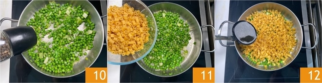 Würzen Sie mit einer Prise schwarzem Pfeffer 10 und geben Sie die ungekochte Pasta in die Pfanne 11. Kochen Sie die Pasta, indem Sie jeweils eine Kelle heiße Brühe hinzufügen, als wäre es ein Risotto 12.