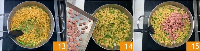 Rühren Sie weiter, um zu verhindern, dass die Pasta am Boden der Pfanne kleben bleibt 13. Wenn die Pasta al dente ist, was etwa 15 Minuten dauert, fügen Sie den gekochten Schinken hinzu 14 und mischen Sie 15.