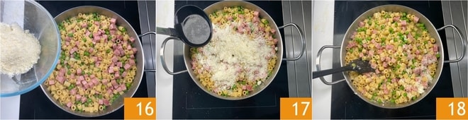 Schalten Sie die Hitze aus und rühren Sie den geriebenen Pecorino 16 und eine letzte Kelle Brühe unter 17, dann gut vermischen 18. Ihre cremige Pasta mit Schinken und Erbsen ist bereit, noch heiß serviert zu werden!