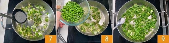 Braten Sie die Frühlingszwiebel 7 Minuten lang an und gießen Sie gelegentlich etwas Gemüsebrühe hinzu 7. Nach dieser Zeit geben Sie die Erbsen hinzu 8 und salzen Sie 9.