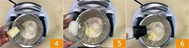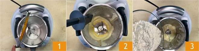 Um die neapolitanische Pastiera mit Bimby® zuzubereiten, beginnen Sie mit dem Mürbeteig: Geben Sie den Zucker und die abgeriebene Schale von Zitrone und Orange in den Mixtopf 1, dann pulverisieren Sie für 10 Sekunden bei Geschwindigkeit 10. Sammeln Sie alles mit einem Spatel auf dem Boden 2 und wiederholen Sie den Vorgang für weitere 10 Sekunden bei der gleichen Geschwindigkeit. Fügen Sie dann das Mehl Typ 00 hinzu 3.