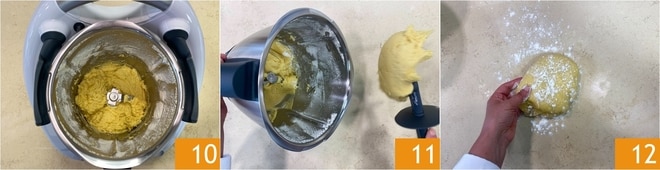 Wenn der Teig fertig ist 10, übertragen Sie ihn auf eine leicht bemehlte Arbeitsfläche 11 und formen Sie mit den Händen einen glatten Teigball 12.