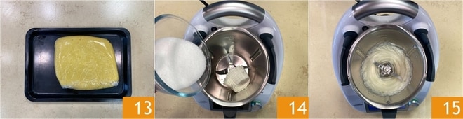 Wickeln Sie den Teigball in Frischhaltefolie und legen Sie ihn für mindestens 6 Stunden in den Kühlschrank 13. Geben Sie in einen sauberen und trockenen Mixtopf den Schafsricotta und den Zucker 14 und mischen Sie für 30 Sekunden bei Geschwindigkeit 4 15.