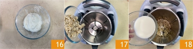 Übertragen Sie die Mischung in eine Schüssel, bedecken Sie sie mit Frischhaltefolie, die direkt aufliegt 16, und stellen Sie sie für 6 Stunden in den Kühlschrank. Geben Sie in den sauberen Mixtopf den gekochten Weizen 17 und die Milch 18.