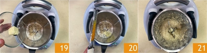 Fügen Sie die Butter 19 und die abgeriebene Schale von Zitrone und Orange 20 hinzu, dann kochen Sie für 20 Minuten bei 80° bei Geschwindigkeit 1 gegen den Uhrzeigersinn. Nach Ablauf dieser Zeit pürieren Sie für 15 Sekunden bei Geschwindigkeit 8 21.