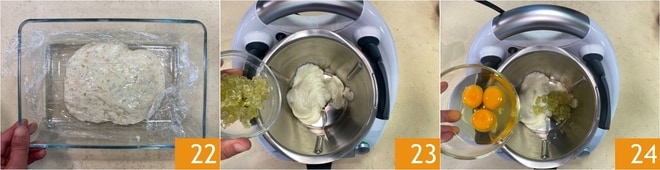 Übertragen Sie die Mischung in eine Schüssel und bedecken Sie sie mit Frischhaltefolie 22, dann lassen Sie sie ruhen. Nach der Ruhezeit des Ricottas geben Sie ihn in den Mixtopf zusammen mit den kandierten Zitronatstücken 23, fügen Sie auch 2 ganze Eier und 1 Eigelb hinzu 24.