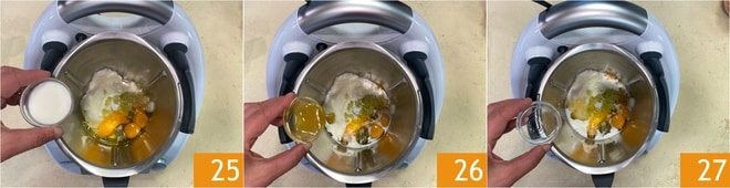 Gießen Sie auch die Milch 25, den Honig 26 und das Orangenblütenwasser 27 hinzu und mischen Sie für 1 Minute bei Geschwindigkeit 4 gegen den Uhrzeigersinn.