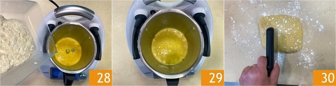 Fügen Sie den gut abgekühlten gekochten Weizen 28 hinzu und mischen Sie für eine weitere Minute bei Geschwindigkeit 3 gegen den Uhrzeigersinn. Lassen Sie die Mischung im Mixtopf, bis sie verwendet wird 29. Heizen Sie den Ofen auf 180° im statischen Modus vor. Nehmen Sie den Mürbeteig aus dem Kühlschrank und teilen Sie ihn in 2 Teile, einen etwas größeren als den anderen 30.