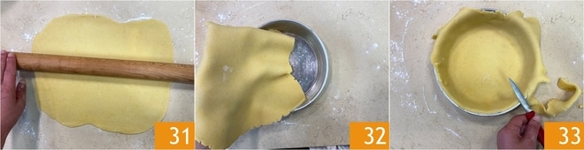 Rollen Sie den größeren Teil mit einem Nudelholz auf einer leicht bemehlten Fläche aus, bis er eine Dicke von etwa 3 mm erreicht 31. Rollen Sie den Mürbeteig auf das Nudelholz und rollen Sie ihn auf eine konische Pastiera-Form mit 20 cm Durchmesser ab (es ist nicht notwendig, die Form zu fetten und zu bemehlen) 32. Drücken Sie den Teig gut auf den Boden und die Ränder, dann entfernen Sie den Überschuss, indem Sie das Nudelholz darüber rollen und mit einem kleinen Messer abschneiden 33.