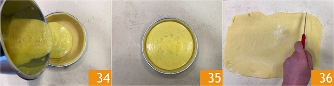 Gießen Sie die vorbereitete Creme in die Mürbeteigschale 34, dann klopfen Sie vorsichtig die Form auf die Arbeitsfläche, um eventuelle Luftblasen zu entfernen 35. Rollen Sie den restlichen Teig aus und schneiden Sie 7 Streifen von 1-2 cm Breite daraus 36.