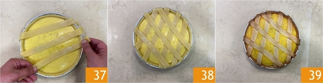 Legen Sie die ersten vier Streifen quer über die Pastiera, bis zum Rand 37, dann legen Sie die restlichen Streifen darüber, um ein Gitter zu bilden 38. Entfernen Sie schließlich den überschüssigen Mürbeteig. Backen Sie die Pastiera im vorgeheizten statischen Ofen bei 180° für etwa 50-55 Minuten, indem Sie sie auf das unterste Regal des Ofens stellen. Lassen Sie sie nach dem Backen vollständig abkühlen, bevor Sie sie aus der Form nehmen 39, dann lassen Sie sie abkühlen und bestäuben Sie sie mit Puderzucker. Ihre neapolitanische Pastiera mit Bimby® ist bereit, genossen zu werden!