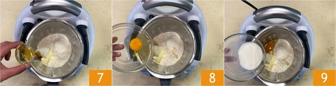 Zum Schluss geben Sie den Honig 7, das Ei 8 und die Milch 9 hinzu. Kneten Sie für 30 Sekunden bei Geschwindigkeit 5.
