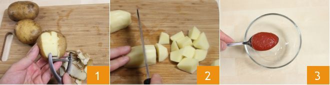 Um die Patatas Bravas zuzubereiten, wascht und schält die Kartoffeln mit einem Sparschäler oder einem kleinen Küchenmesser 1, schneidet sie in kleine Stücke 2 und stellt sie beiseite. In eine Schale gebt die Tomatensoße 3