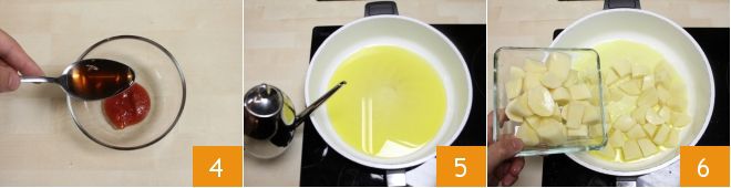 und den Essig 4, mischt die Sauce und bewahrt sie auf, sie wird zum Würzen der Kartoffeln benötigt. In eine breite Pfanne gebt das Olivenöl 5, dann fügt die Kartoffelstücke hinzu 6