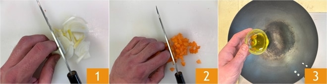 Um die Buchweizen-Penne mit Pilzen im Wok zuzubereiten, beginnen Sie damit, das Gemüse zu putzen. Schneiden Sie die Zwiebel 1 und die Karotte 2 in dünne Scheiben, erhitzen Sie eine Wok-Pfanne vor und geben Sie die Hälfte des Öls hinein 3.