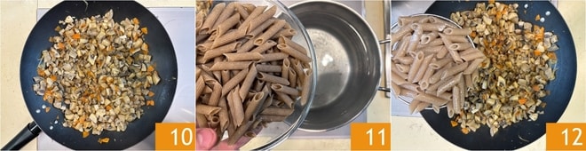 Kochen Sie weiter bei mittlerer bis hoher Hitze und rühren Sie häufig um, um zu verhindern, dass die Zutaten am Boden des Woks anbrennen 10. Die Buchweizen-Penne in kochendem Salzwasser kochen 11, wenn sie fertig sind, abseihen und in den Wok geben 12.