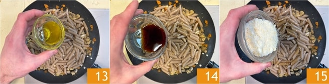 Zum Schluss geben Sie das restliche Öl 13, die glutenfreie Sojasauce 14 und den geriebenen Parmesan hinzu 15.