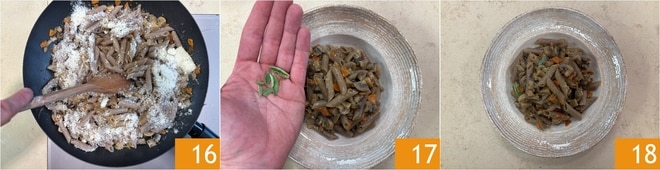Nun müssen Sie nur noch alles gut umrühren, damit sich alle Zutaten vermischen 16, mit einigen Salbeiblättern aromatisieren 17 und Ihr Gericht ist servierfertig! 18.