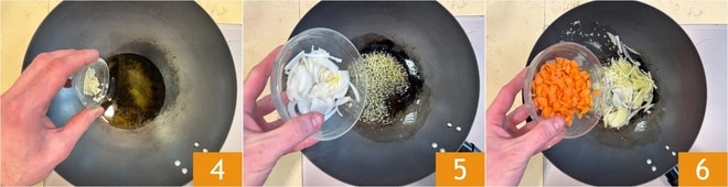 Fügen Sie den fein gehackten Knoblauch 4, die geschnittene Zwiebel 5 und die gehackten Karotten 6 in den Wok.