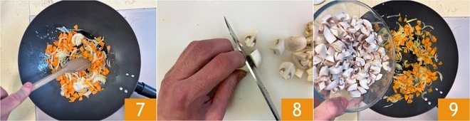 Halten Sie die Temperatur mittel-hoch und rühren Sie häufig mit einem Löffel um 7. Wie man Steinpilze putzt und schneiden Sie sie in Stücke 8, dann geben Sie sie zusammen mit den restlichen Zutaten in die Pfanne 9.