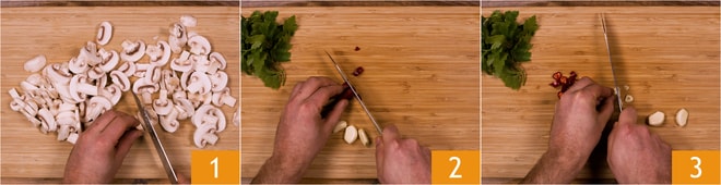Um die Penne all'Arrabbiata mit Champignons zuzubereiten, schneiden Sie zuerst die Pilze in Scheiben 1. Schneiden Sie die Chilischote in Stücke 2, schälen Sie den Knoblauch und schneiden Sie ihn in Scheiben 3.