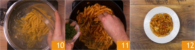 Wenn das Wasser kocht, geben Sie die Pasta hinein 10 und kochen Sie sie al dente. Gießen Sie sie ab und geben Sie sie direkt in die Pfanne. Gut umrühren, die gehackte Petersilie hinzufügen 11 und erneut umrühren. Servieren Sie die Penne all'Arrabbiata mit Champignons noch heiß 12.