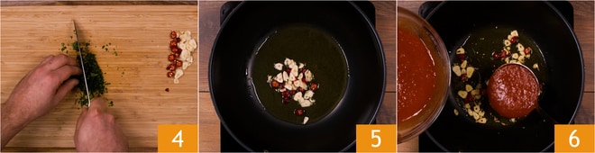 Zum Schluss hacken Sie auch die Petersilie 4. Erhitzen Sie eine gute Menge extra natives Olivenöl in einer ziemlich großen Pfanne und fügen Sie Knoblauch und Chili hinzu. Braten Sie alles bei mäßiger Hitze an und achten Sie darauf, den Knoblauch nicht zu verbrennen 5. Fügen Sie die Tomatensauce hinzu 6 und lassen Sie die Sauce bei mäßiger Hitze kochen.