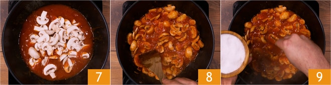 Geben Sie dann auch die zuvor geschnittenen Pilze hinzu 7 und lassen Sie die Sauce etwa 10-15 Minuten köcheln, bis sie die richtige Konsistenz erreicht hat 8. In der Zwischenzeit bringen Sie einen Topf mit gesalzenem Wasser zum Kochen, das für das Kochen der Pasta benötigt wird. Sobald die Sauce bereit ist, salzen Sie die Pilzsauce 9.
