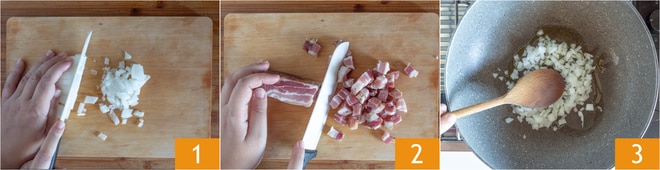 Um die Penne alla Wodka zuzubereiten, schälen Sie zuerst eine Zwiebel und schneiden Sie sie fein 1. Schneiden Sie auch den geräucherten Speck in Würfel 2. Geben Sie das Öl in eine Pfanne, fügen Sie die Zwiebel hinzu 3 und braten Sie sie 5 Minuten lang an.