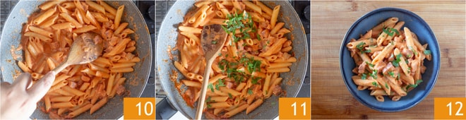 Rühren Sie gut, um die Pasta mit der Sauce zu vermischen 10. Zum Schluss mit gehackter Petersilie würzen 11. Servieren Sie und garnieren Sie mit einigen Petersilienblättchen. Ihre Penne alla Wodka sind bereit, genossen zu werden 12!