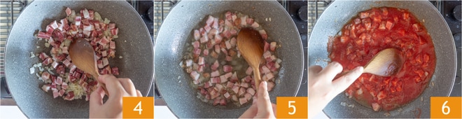 Fügen Sie den Speck hinzu und braten Sie ihn 5 Minuten an 4. Löschen Sie mit dem Wodka ab 5 und lassen Sie den gesamten Alkohol bei mittlerer Hitze verdampfen. Geben Sie dann das Tomatenpüree hinzu 6 und kochen Sie es bei schwacher Hitze 10 Minuten lang. In der Zwischenzeit kochen Sie die Penne in gesalzenem, kochendem Wasser.